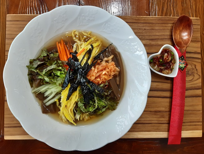 - 야채: 당근, 오이, 피망 등을 곱게 채썰어 사용합니다. 야채는 묵과 함께 곁들여 신선한 맛을 더해줍니다.