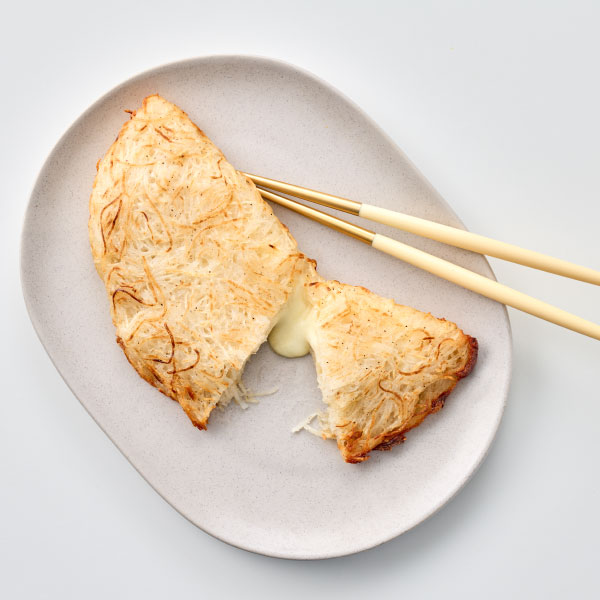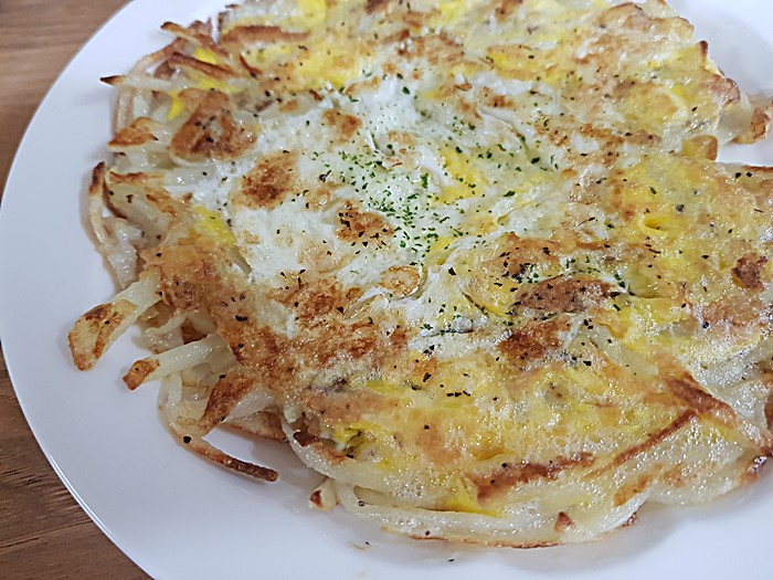 단계 3: 감자채전이 바삭하게 구워질 때까지 한쪽면을 구워주세요. 그 후, 뒤집어 반대편도 같은 방식으로 구워주세요.