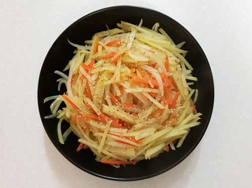 - 감자를 깨끗하게 씻고 껍질을 벗깁니다. 그리고 얇게 슬라이스하여 감자채를 만듭니다.