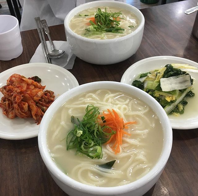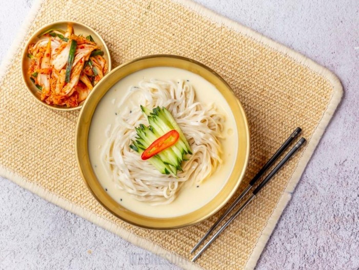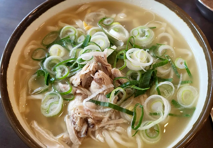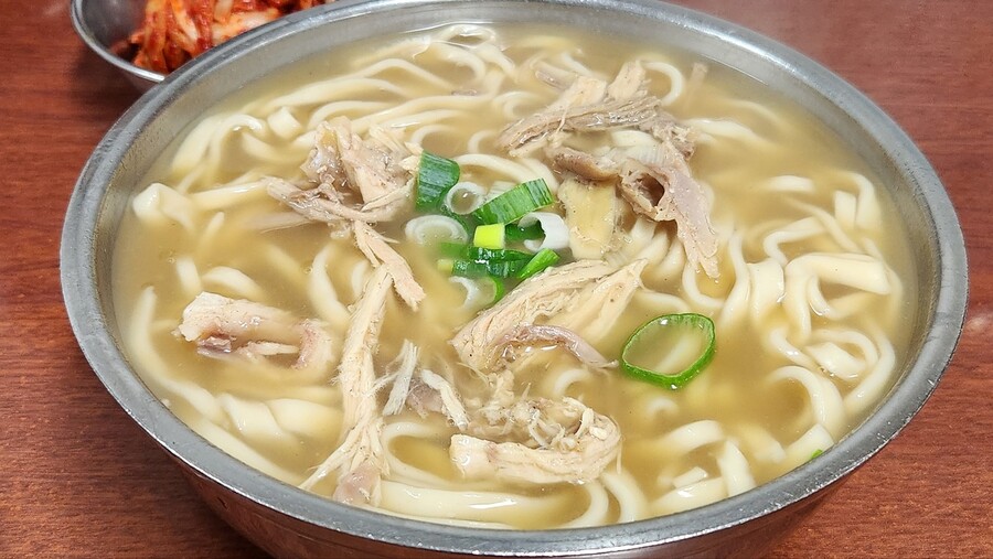4. 칼국수 그릇에盛る: 국물이 끓이고 면을 넣은 후 면이 익으면 준비된 그릇에盛り付け하세요. 고기, 파, 김 등을 추가하여 개인의 취향에 맞게 즐기실 수 있습니다.