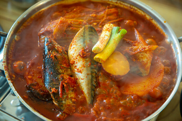 - 뚜껑을 덮고 중불에서 고등어가 익을 때까지 약 10분간 끓입니다.