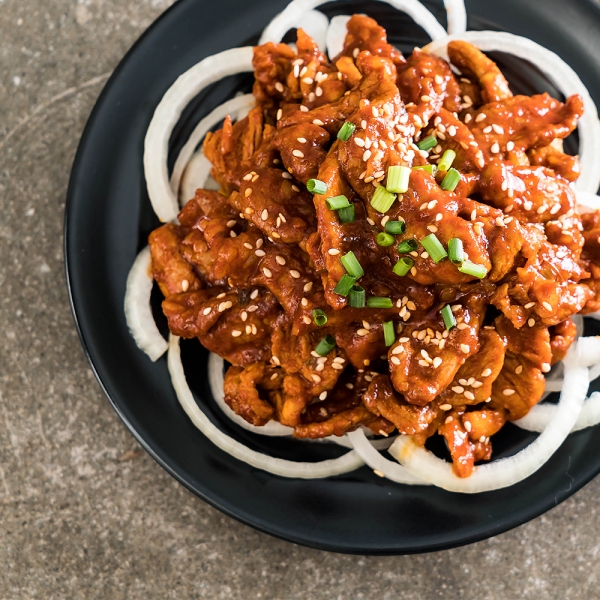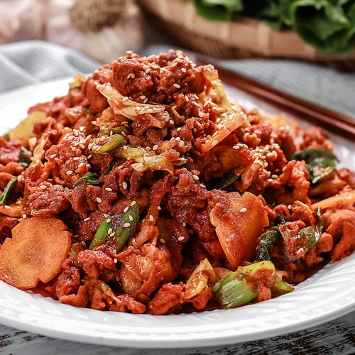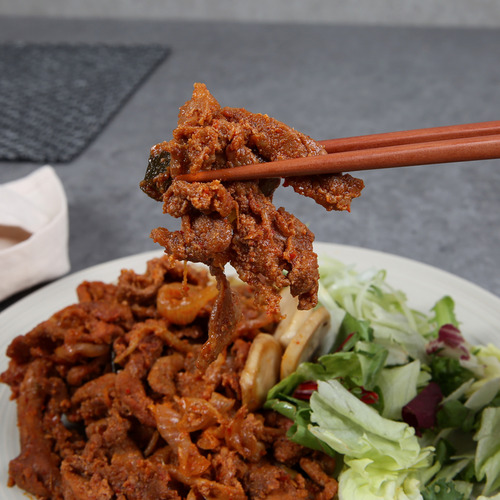 4. 그 후에 접시에 담아 고추장불고기를 완성하세요. 이제 맛있는 고추장불고기가 완성되었습니다!