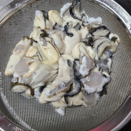 첫 번째 단계는 굴의 불순물을 제거하는 것입니다. 신선한 굴을 깨끗한 소금물에 살살 흔들어 씻어주세요. 이렇게 하면 굴의 표면에 남아있는 불순물이 제거됩니다. 헹군 후에는 체에 밭쳐 물기를 완전히 빼주어야 합니다! 👍 물기가 남아 있으면 튀길 때 기름이 튀므로 주의해야 해요~.