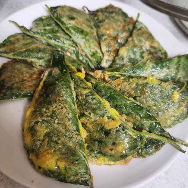 단계 4: 깻잎전이 골드 브라운으로 익을 때까지 앞뒤로 뒤집어가며 굽습니다. 바삭한 표면이 익으면 완성입니다.