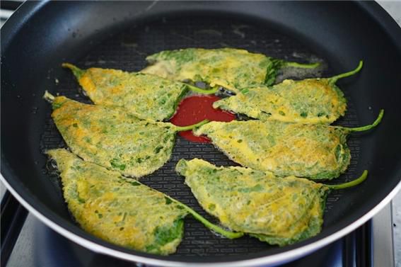 단계 3: 부침가루에 깻잎을 하나씩 찍어 전체적으로 골고루 발라줍니다. 깊은 팬에 식용유를 두르고 중약 불에서 부칩니다.