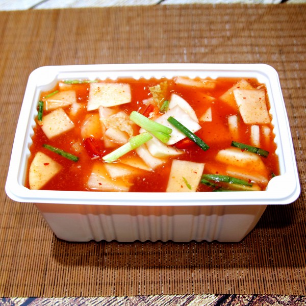 - 통조림: 양념이 잘 섞인 나박을 깨끗한 김치 저장용기에 차곡차곡 담습니다. 이때 공기가 들어가지 않도록 잘 눌러 담아야 발효가 고르게 이루어집니다.