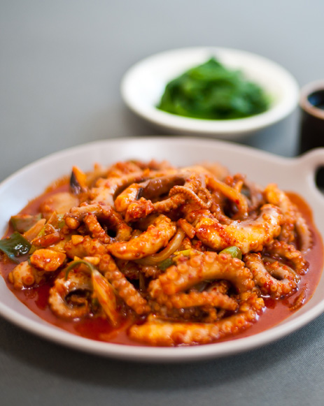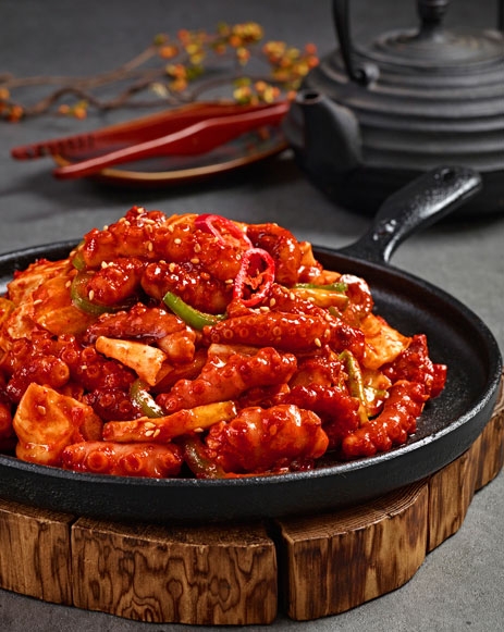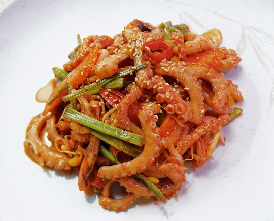 낙지를 손질한 후 양념 재료와 함께 잘 버무려 둡니다. 팬에 기름을 두르고 양념이 고루 섞인 낙지를 볶아낸 후 야채를 넣고 함께 볶아줍니다. 마지막으로 대파 등을 뿌려 완성합니다.