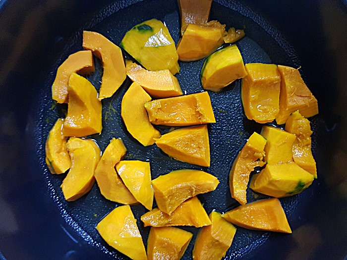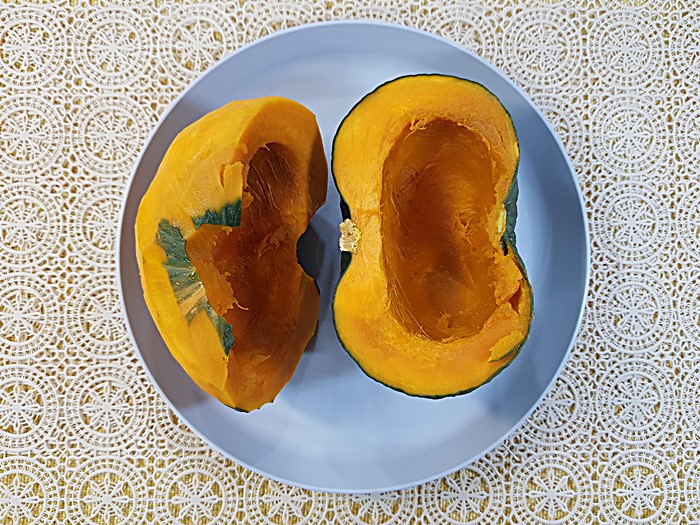 단호박의 껍질을 깨끗이 씻은 후, 씨를 제거합니다. 껍질을 벗기지 않고 그대로 사용해도 좋지만, 취향에 따라 껍질을 벗기고 사용할 수도 있습니다. 단호박을 먹기 좋은 크기로 잘라주세요. 너무 큰 조각은 익는 데 시간이 걸릴 수 있으므로, 적당한 크기로 자르는 것이 중요합니다. ^^