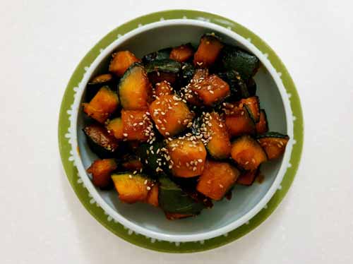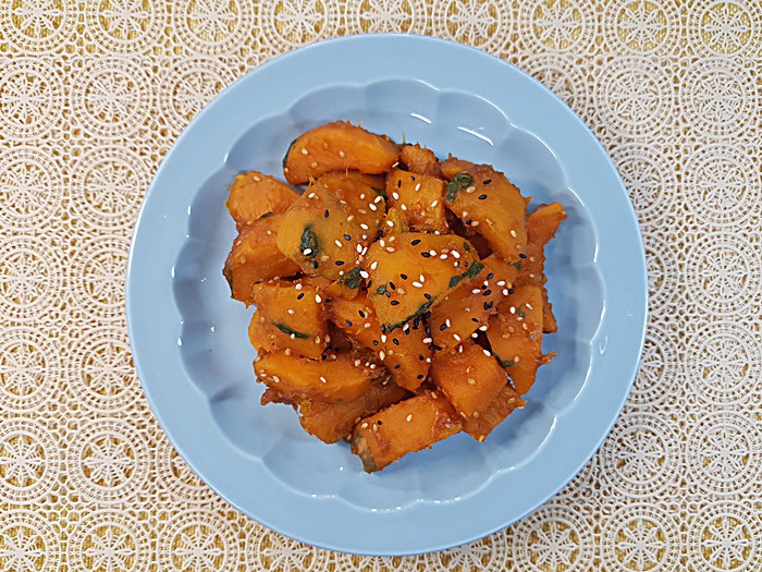 조리가 끝나면 참기름과 깨소금을 넣어 마지막으로 섞어줍니다. 참기름의 고소한 향과 깨소금의 식감이 단호박조림의 풍미를 더욱 높여줄 것입니다. !