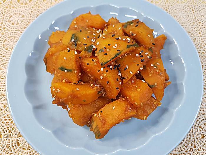 한국의 전통적인 반찬인 김치와 함께 먹으면 더욱 맛있습니다. 김치의 매콤함과 단호박조림의 달콤함이 잘 어우러져 풍성한 맛을 제공합니다. !