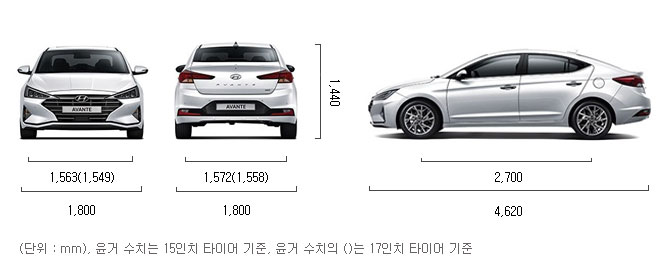 더 뉴 아반떼의 외관 제원은 다음과 같습니다: