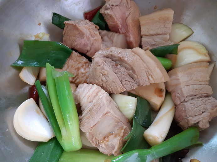 재료가 준비되면, 냄비에 돼지고기, 대파, 마늘, 생강을 넣고, 간장, 설탕, 청주를 넣은 뒤, 물을 부어줍니다. 이때 물의 양은 돼지고기가 잠길 정도로만 넣어 주세요. 냄비에 재료들을 잘 섞고, 뚜껑을 덮은 후 중약불에서 2시간 정도 끓여주세요. 고기가 부드럽게 익으면서 양념이 배어들도록 합니다. ^^