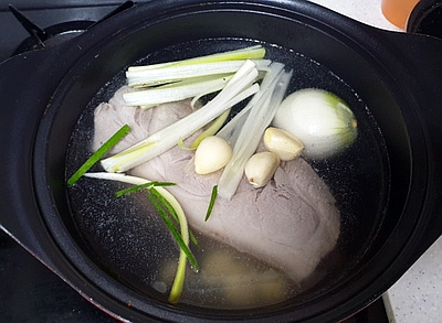먼저 돼지고기를 깨끗이 씻고, 큰 덩어리로 썬 후 냄비에 넣습니다. 그 위에 물 2리터를 붓고, 마늘, 생강, 파를 넣어줍니다. 이때 된장 1큰술을 넣어 국물의 깊이를 더할 수 있어요. ^^