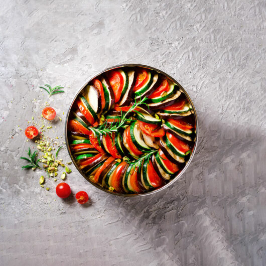 재료들을 잘 섞어주면, 고급스러운 라따뚜이가 완성됩니다. 레몬 슬라이스나 체리로 장식하여 더욱 아름답게 만들어보세요.