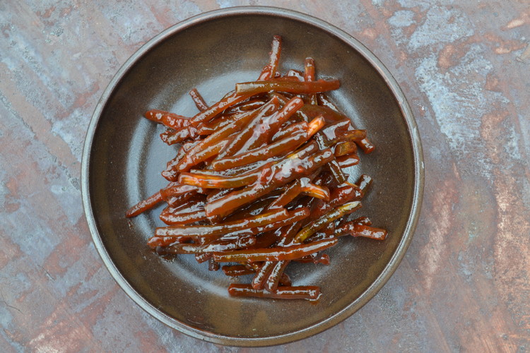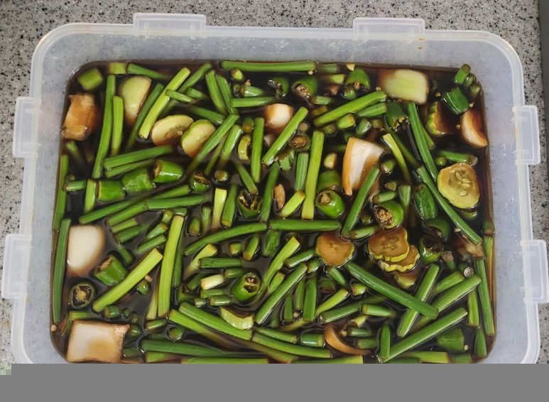 장아찌를 만들 때는 과도한 소금 사용을 피해야 합니다. 간장과 설탕이 고루 섞이도록 주의 깊게 저어야 합니다.