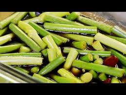 차가운 마늘쫑장아찌를 꺼내어 맛보고, 짭짤하고 달콤한 맛을 즐깁니다. 밥과 함께 먹거나 안주로도 좋습니다!