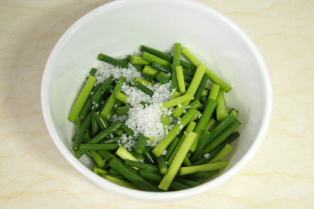 마늘쫑을 적당한 길이로 잘라내고, 끓는 물에 데칩니다. 데친 마늘쫑은 식힌 후 키친타올로 물기를 제거합니다.