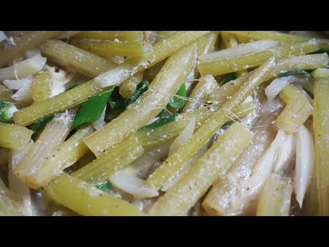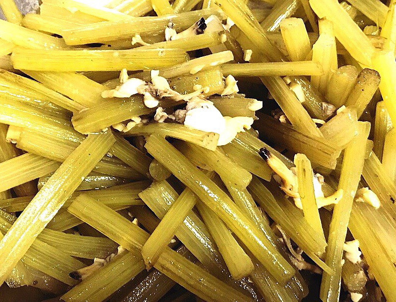 이제 손질한 머위대를 팬에 넣고 볶기 시작합니다. 머위대는 금방 익으므로, 약 3~5분 정도 볶아주세요. 색이 변하고 아삭함이 살아있는 것이 좋습니다! :D