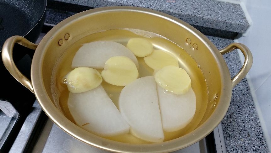 냄비 바닥에 썰어둔 무를 먼저 깔아주세요. 무는 갈치조림의 맛을 좌우하는 중요한 역할을 하므로, 바닥에 깔아 갈치의 국물이 무에 충분히 스며들 수 있도록 하는 것이 포인트입니다~!