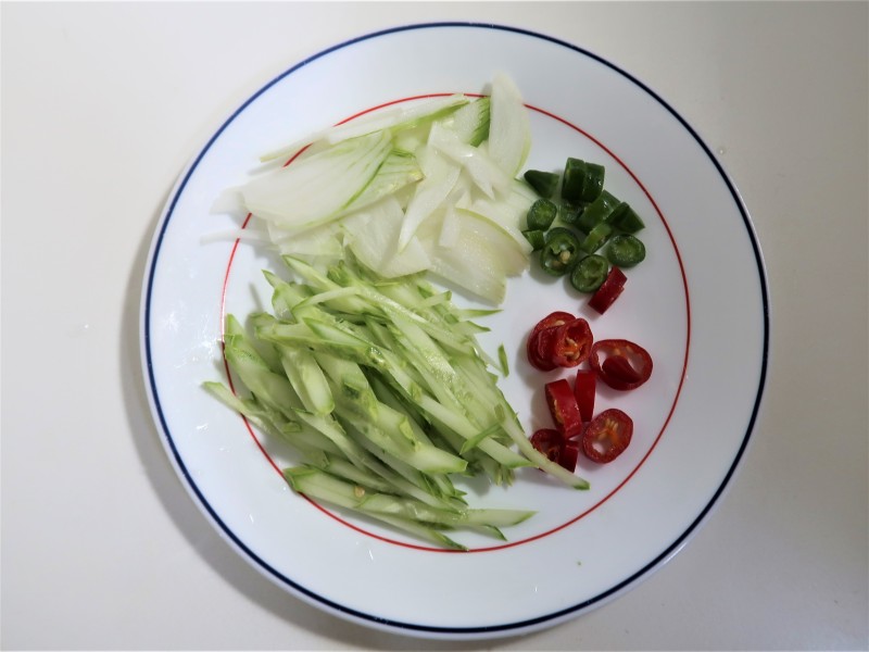 오이는 깨끗하게 씻어준 후, 얇게 채를 썰어주세요. 오이를 더 상큼하게 먹고 싶다면 소금에 살짝 절여도 좋아요. :) 절인 오이는 물기를 꼭 짜서 사용하세요.