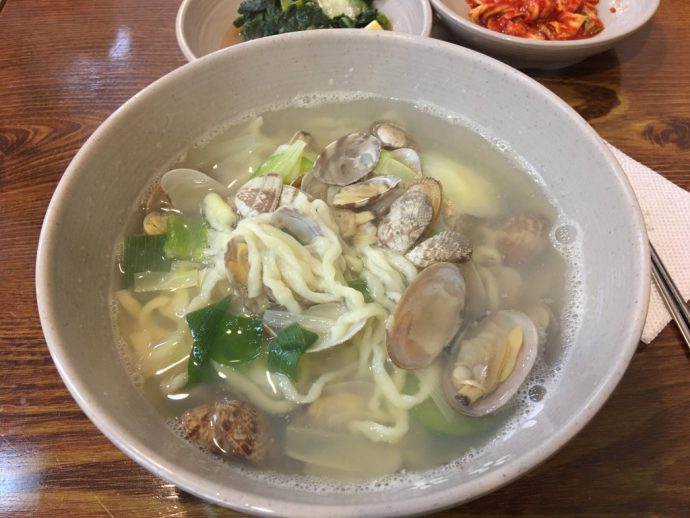 재료: 신선한 바지락 500g, 밀가루 400g, 물 1.5리터, 대파 1대, 마늘 4쪽, 간장 2큰술, 소금 약간, 후춧가루 약간
