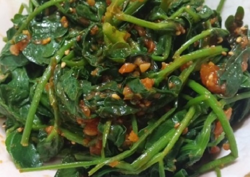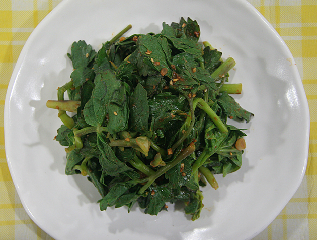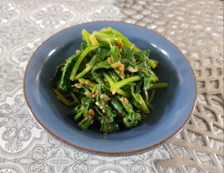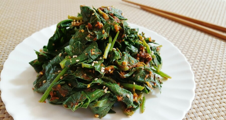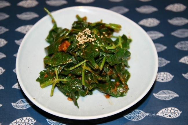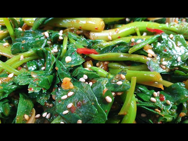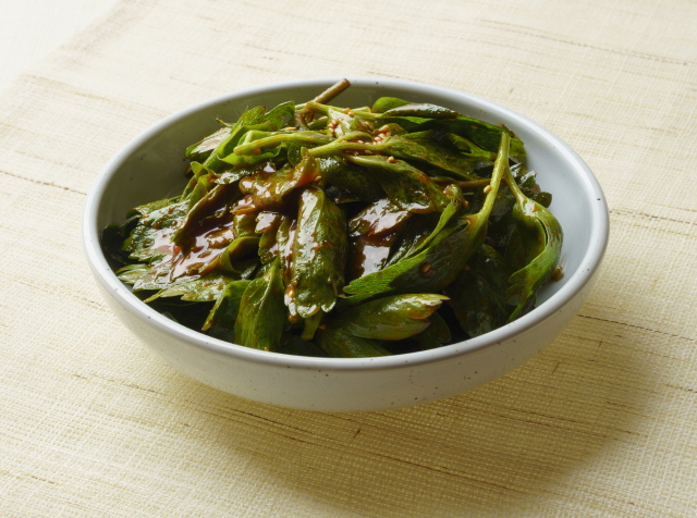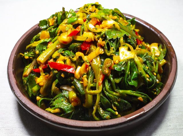 - 간장, 참기름, 다진 마늘, 참깨를 넣고 버무려주세요.: 냄비에 데친 방풍나물을 넣고 간장, 참기름, 다진 마늘을 넣고 골고루 버무려주세요.