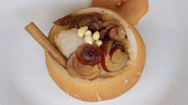 배의 가운데에 대추와 잣을 넣고, 계피 스틱을 넣어줍니다. 배의 속에 재료를 잘 채워 넣어야 풍미가 더욱 좋습니다. 🌟