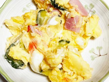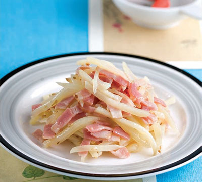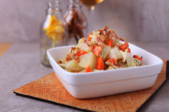 - 큰 그릇에 삶은 감자, 볶은 베이컨, 다진 양파, 당근을 모두 넣으세요.