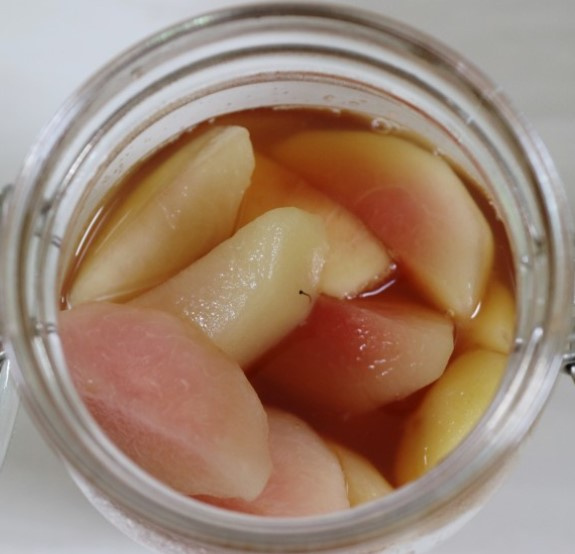 소독한 용기에 손질한 복숭아를 차곡차곡 담아주세요. 그 위에 준비한 시럽을 부어주고, 공기가 들어가지 않도록 적절하게 눌러줍니다. 🍯
