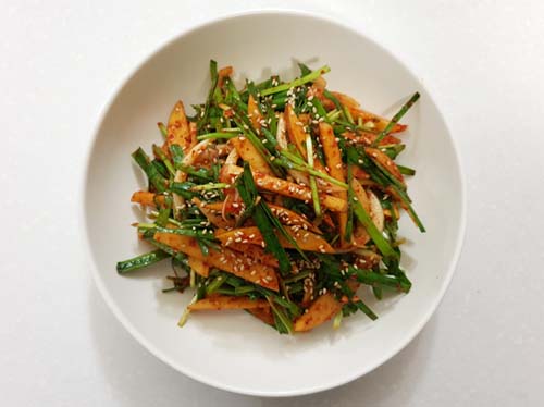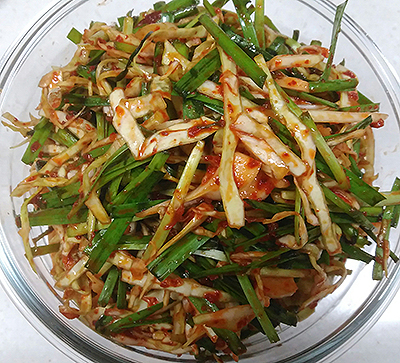 - 부추와 양념 섞기: 준비한 부추에 양념을 골고루 뿌려 잘 섞습니다. 부추가 양념에 고르게 입혀지도록 합니다.
