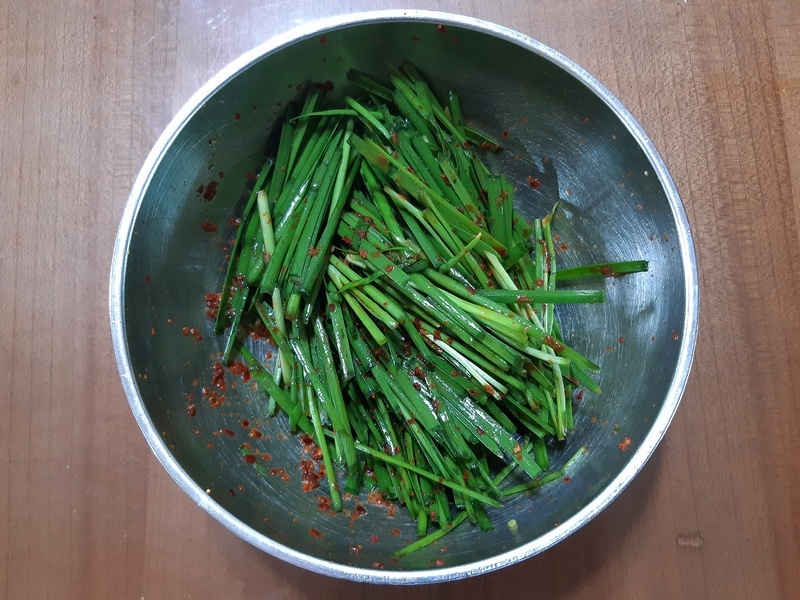 - 부추와 양념 섞기: 준비한 부추에 양념을 넣고 손으로 골고루 섞어줍니다. 부추가 양념에 골고루 물들도록 합니다.