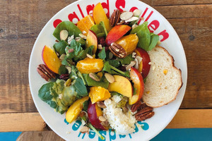 넓은 볼에 샐러드 채소를 깔고 복숭아, 블루베리를 보기 좋게 올려주세요. 그 위에 볶은 호두와 페타 치즈를 골고루 뿌린 뒤 드레싱을 뿌려 마무리! 🎉
