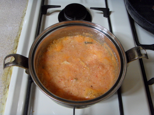 - 냄비에 물을 붓고 된장을 풀어주세요. 된장이 물에 풀리면 중불에서 끓입니다.