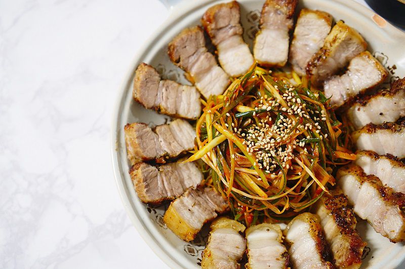 삼겹살을 깨끗이 세척한 후 끓는 물에 살짝 데칩니다. 이 과정에서 고기의 불순물을 제거하고, 삼겹살이 물리지 않도록 주의합니다. 그 후, 간장, 다진 마늘과 생강을 잘 섞어 양념하여 삼겹살에 골고루 발라줍니다.