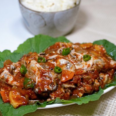 - 팬에 굴과 마늘을 볶아주세요. 고추장을 넣고 볶아주세요. 식초, 설탕, 홍고추를 넣어 섞어주세요.