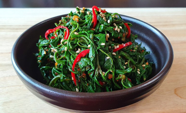 '신맛과 쌉쌀한 맛이 특징인 고춧잎 나물 무침'에서 가장 두드러진 특징은 고춧잎의 신맛입니다. 고춧잎은 비타민 C와 비타민 A가 풍부하며, 특유의 톡 쏘는 맛은 이 요리에 활력을 불어넣습니다. 이 맛은 한국 요리에서 매우 소중하게 여겨집니다.
