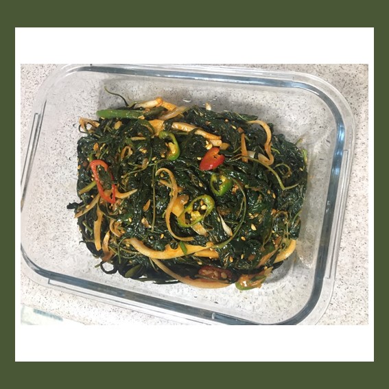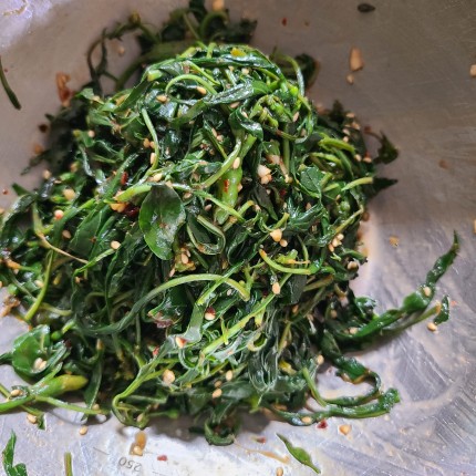 '신맛과 쌉쌀한 맛이 특징인 고춧잎 나물 무침'은 그 특유의 매콤한 맛과 함께 상큼하고 고소한 맛을 느낄 수 있습니다. 고추장과 참기름의 향긋한 조화가 입맛을 돋우며, 어우러진 고춧잎의 씹는 맛은 상쾌함을 선사합니다.