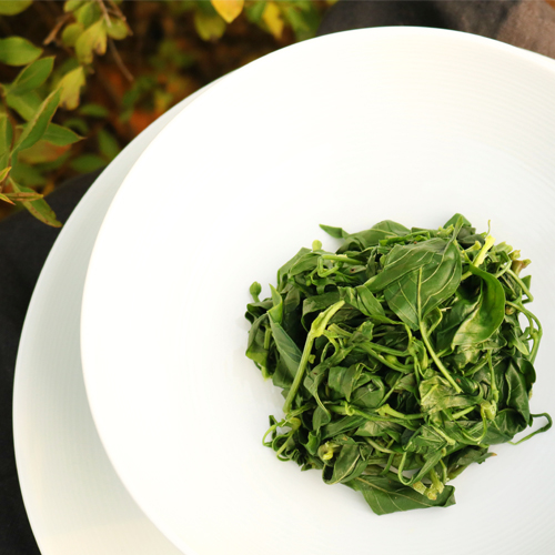 2. 끓는 물에 소금을 넣고 고춧잎을 삶아 준비합니다.