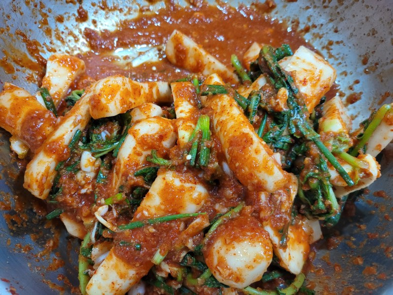 - 양념 재료 섞기: 고춧가루, 새우젓, 설탕 등을 섞어 김치 양념을 만듭니다.