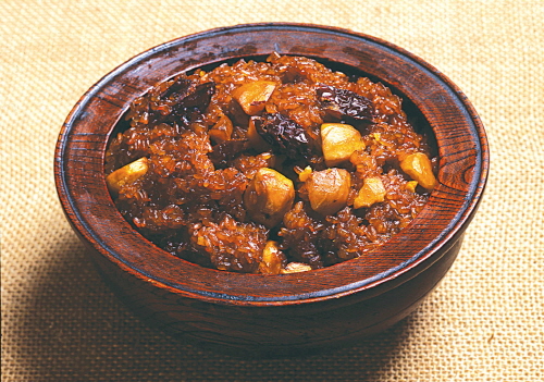 약밥에 육수와 고기를 넣고 끓여 스튜를 만들 수 있습니다. 푸짐한 한 끼 식사로 제격입니다.