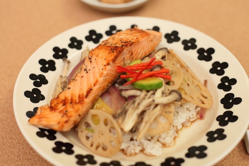 - 이제 밥을 그릇에 담고 볶은 채소와 연어를 올리면 완성!