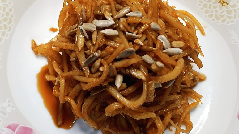 오징어채는 물에 가볍게 헹궈서 불순물을 제거해 주세요. 너무 세게 문지르면 오징어채가 찢어질 수 있으니 주의하세요! 깨끗한 재료가 맛있는 요리의 기본이죠! 💧