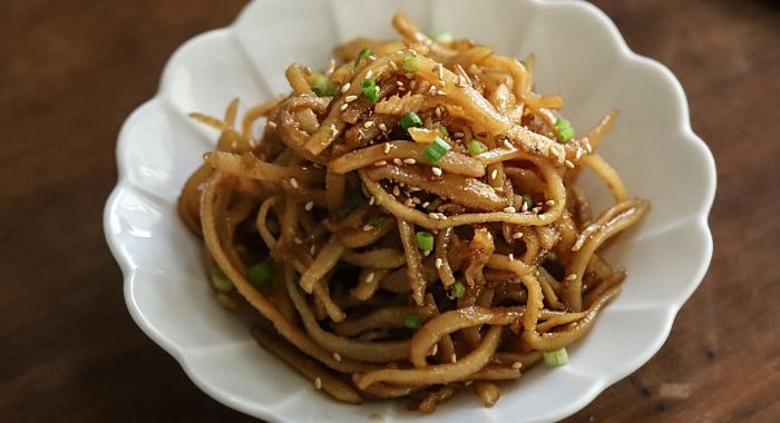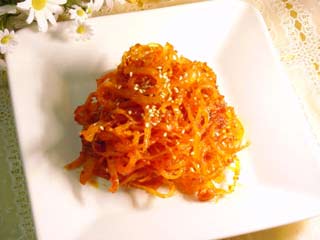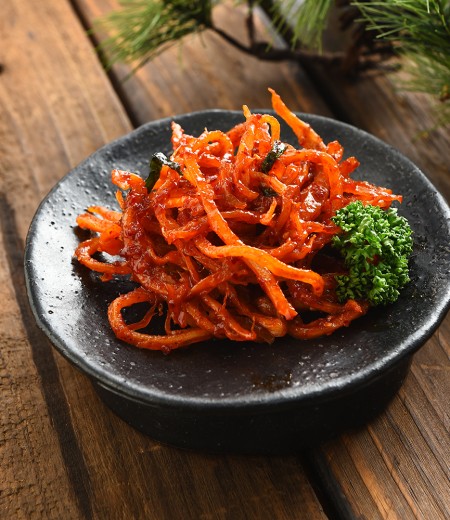 - 마무리: 센 불에서 물기가 증발할 때까지 볶아, 마지막에 참기름을 한 방울 넣고 볶아줍니다. 향긋한 오징어채볶음이 완성됩니다.