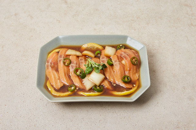연어가 완전히 익었으면 완성된 '완전히 새로운 연어장'을 그릇에 담아 내놓습니다. 선택적으로 장소의 특별한 장식으로 추가할 수 있습니다.