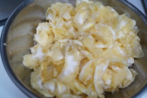 유자와 설탕이 잘 섞였다면, 물을 추가할 차례입니다. 물은 약 200ml 정도 추가해 주세요. 물을 너무 많이 넣지 않도록 주의하세요! 너무 많은 물을 넣으면 잼의 농도가 너무 묽어질 수 있습니다. 적당한 농도를 맞춰주세요! ^_^