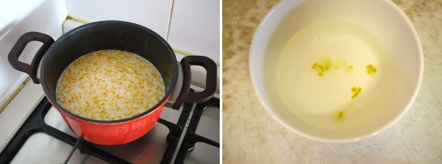 2. 유자와 설탕을 섞고, 물을 부어주세요. 그리고 중불로 끓입니다. 이때 레몬즙이나 오렌지즙을 추가해도 좋아요! :)