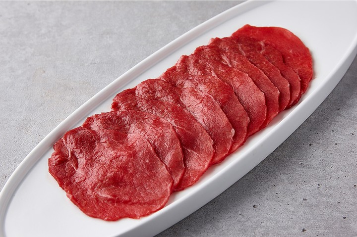먼저, 소고기를 얇게 저며주세요. 고기의 두께는 약 3~4mm 정도가 적당합니다. 얇게 썰면 고기가 더 빨리 익고, 식감이 좋습니다. 고기가 얇게 썰어지면 더욱 맛있는 육전이 됩니다! 😋