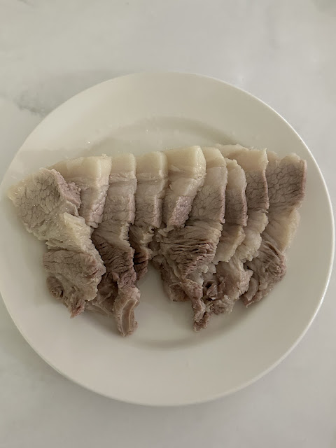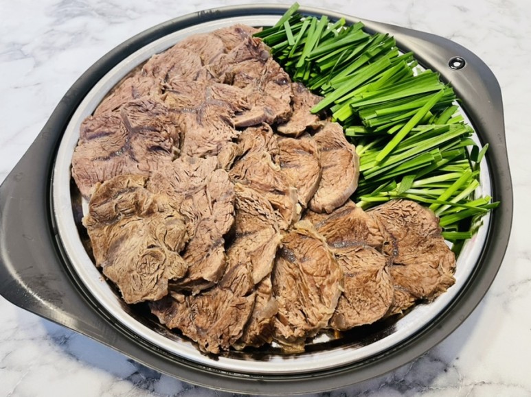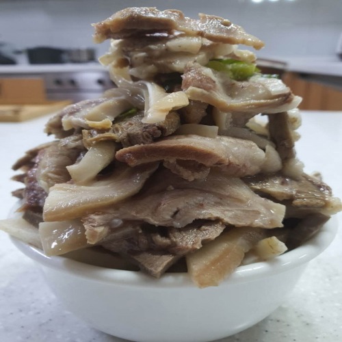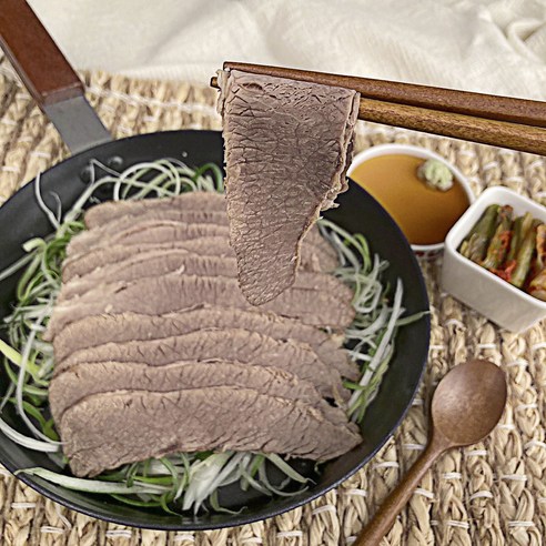 고기가 완전히 삶아지면 불을 끄고, 물기를 제거하여 적당한 크기로 잘라주세요. 그리고 접시에 담아 마무리합니다. 고기의 식감과 풍미를 높이기 위해 곁들일 소스나 반찬과 함께 제공하면 완성입니다.