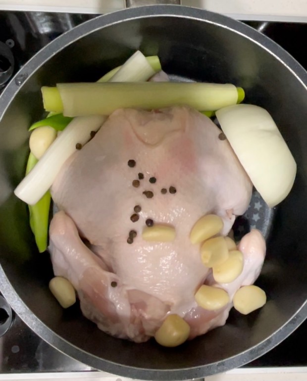 큰 냄비에 닭을 넣고 물을 충분히 부어 중불에서 끓이기 시작해요. 거품이 올라오면 제거해 주세요. 이렇게 하면 깔끔한 국물이 완성된답니다!