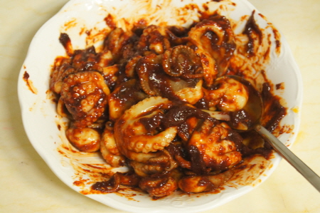 고추장 2큰술, 고춧가루 1큰술, 간장 1큰술, 맛술 1큰술, 다진 마늘 1큰술, 생강즙 1/2작은술, 설탕 1/2큰술을 볼에 넣고 골고루 섞어주세요. 여기에 배즙 1큰술을 추가하면 윤기와 깊은 맛이 살아납니다!! 과학적으로 배즙의 프로테아제 효소가 주꾸미 단백질을 분해해 연하게 만든답니다(Food Chemistry, 2020).